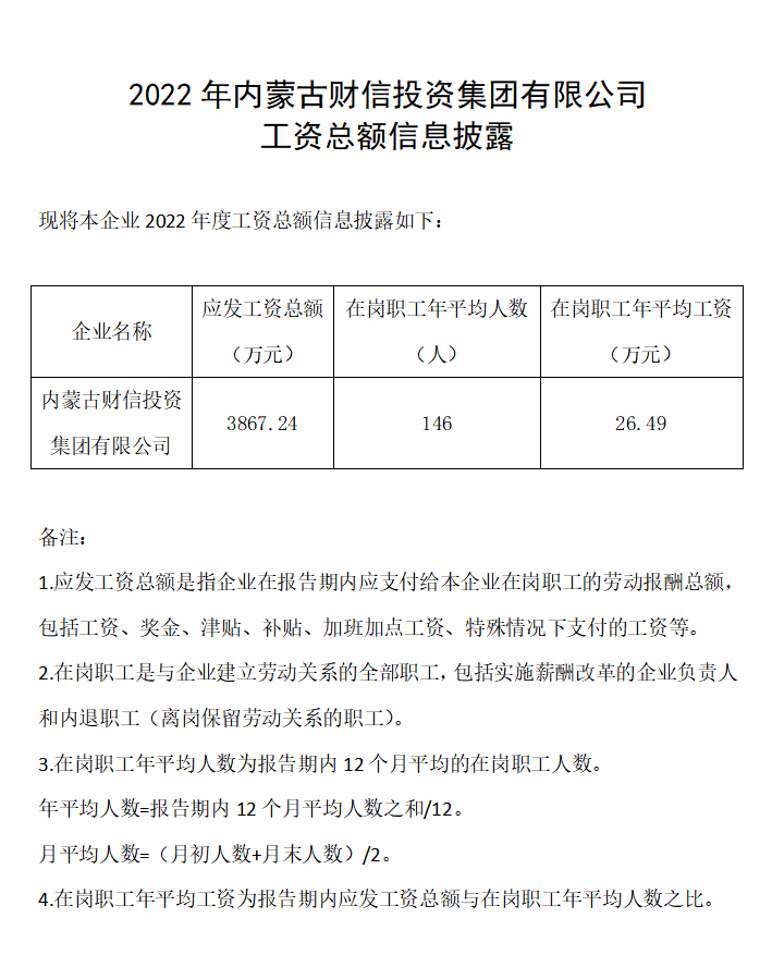 2022年內(nèi)蒙古財(cái)信投資集團(tuán)有限公司工資總額信息披露